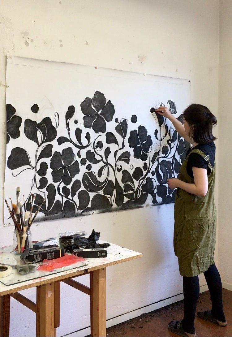 Bild från ateljén ... I skapandet av en mural tapet till Krasse kollektionen tecknar jag mönsterbilden i kol. Sedan läggs krasse mönstret in i datorn i skapandet av själva tapeten.