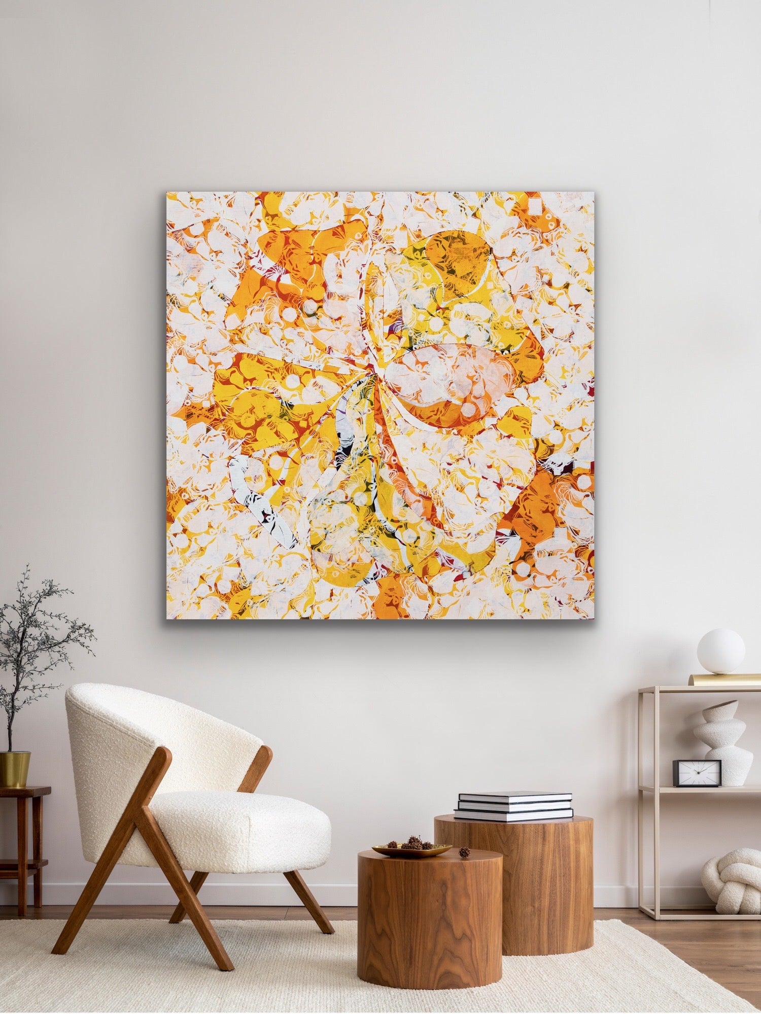 Originalmålningen Krasse (120x120 cm), fyllt av ett handtryckta mönster i screentryck som legat till grund för tapeterna i kollektionen.